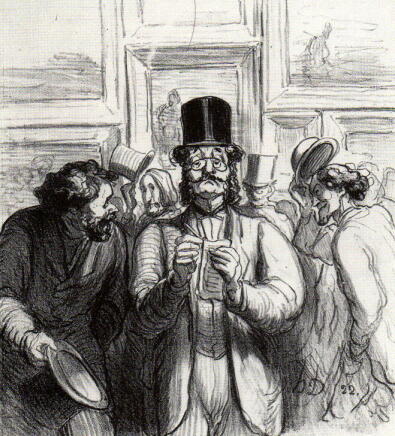 | サロンのスケッチ、影響力のある批評家が歩く もったいぶってメモをとる批評家に少しでも良い評価を得ようと愛想笑いを浮かべて挨拶する画家たち。 サロンは出品される作品数が多くなかなか批評家の目にとまらないため画家はあの手この手で批評家たちに接した。 |